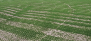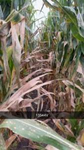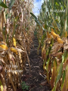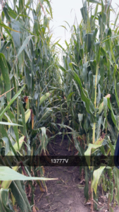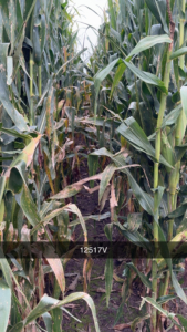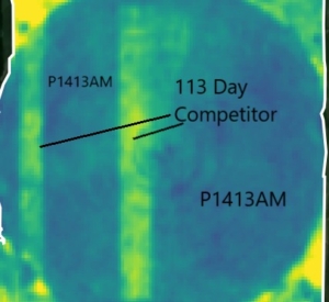- Plant populations….Consider increasing population drop under heavy residue and cooler conditions. This is especially so for soybeans….if planting in April consider bumping up soybean seed drop by 10% to offset adverse weather conditions….even more needed if planting in April and have a tilled seedbed. Most of the time any replant discussions would’ve been eliminated had seed drop been bumped up at planting. Seed corn maggots have been an issue the last few years on tilled, sandy soils when planting in April. In these situations, it is highly recommended (almost a requirement) to use Lumiderm insecticide seed treatment for increased protection from seed corn maggots. See photo below from 2025 field with a split planter of Lumiderm vs. no Lumiderm…upwards of a 20 bu/a increase in the strips w/ Lumiderm versus no Lumiderm.